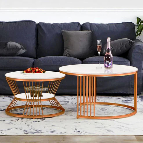 The sleek copper-finish metal frames offer a warm, vintage-inspired tone that pairs effortlessly with both classic and contemporary interiors. Whether used as a coffee table duo or accent tables, their nesting design adds flexibility without compromising on style.