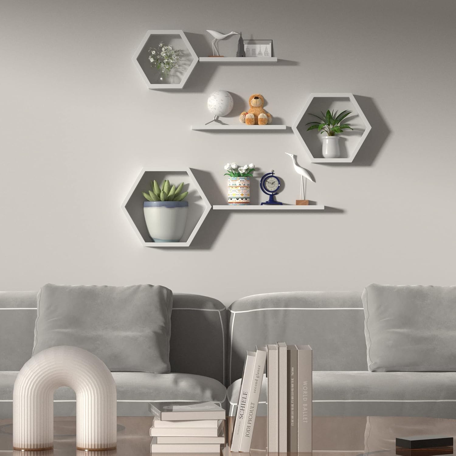 Anasay Floating Wall Shelves for Living Room Wall Mounted Set of 6 Hexagon Shelves for Photos Plants and Wall Decor Honeycomb Wall Shelves for Bedroom White