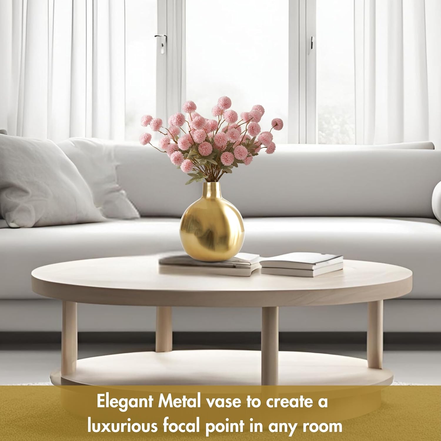 This beautifully crafted golden round vase adds charm to your décor. Ideal for home, office, weddings, and festivals. A perfect tabletop accent for all occasions.