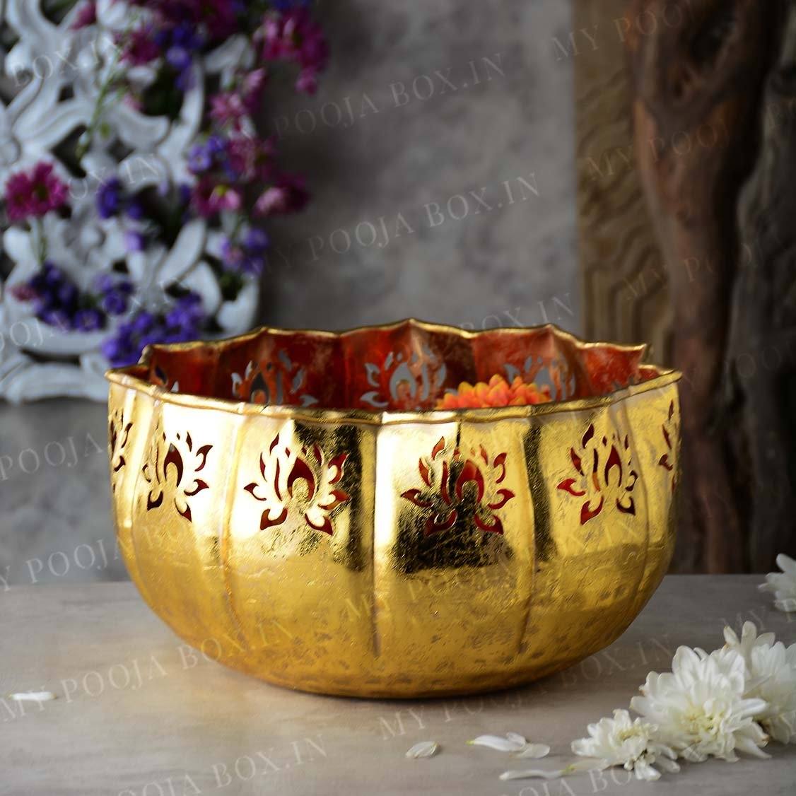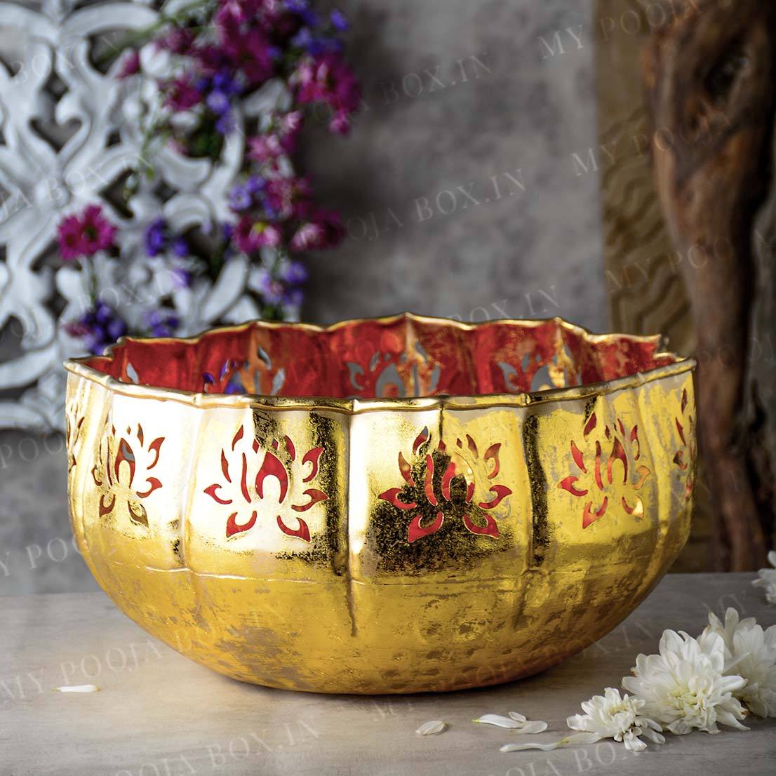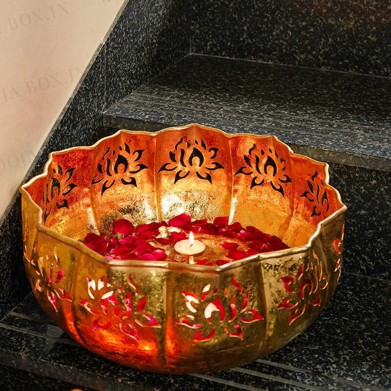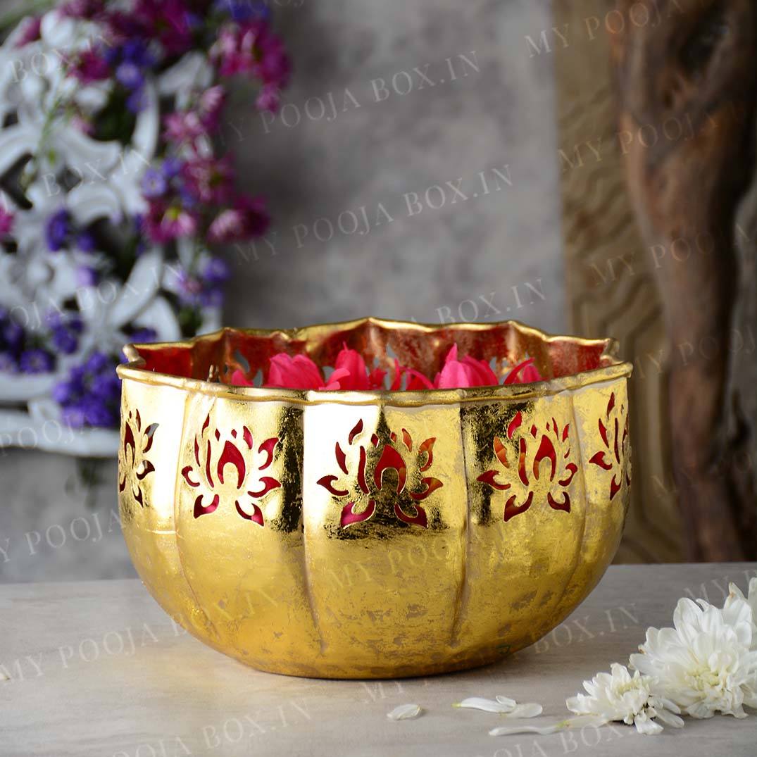 Urli’s are the most useful stuff when it comes to storing small things. I am presenting to you a shiny gold lotus urli. This url is quite astounding and striking in appearance. It is available in various sizes. This urli is made from metal and has a sleek golden colour. On the border are lotus-shaped carvings that look incredible. These urli’s can be used to store flowers and another puja samagri in puja ghar. They have a simple and sober design. They can also be placed as a showpiece. This urli can also be used to decorate puja ghars or living areas during festive occasions. Get these spectacular URLs at the most amazing deals.