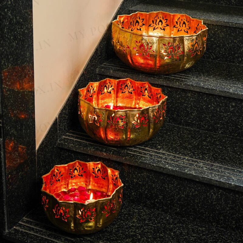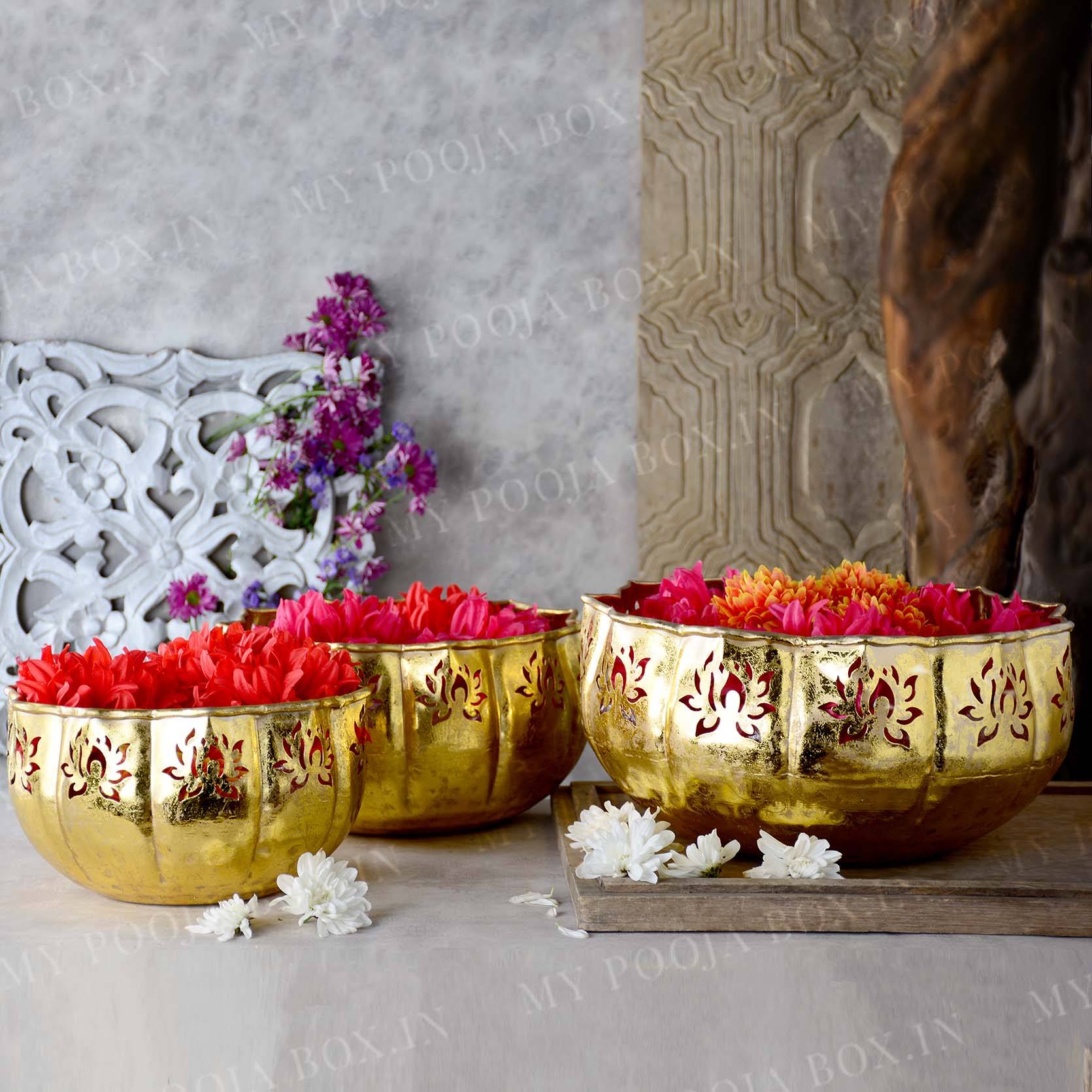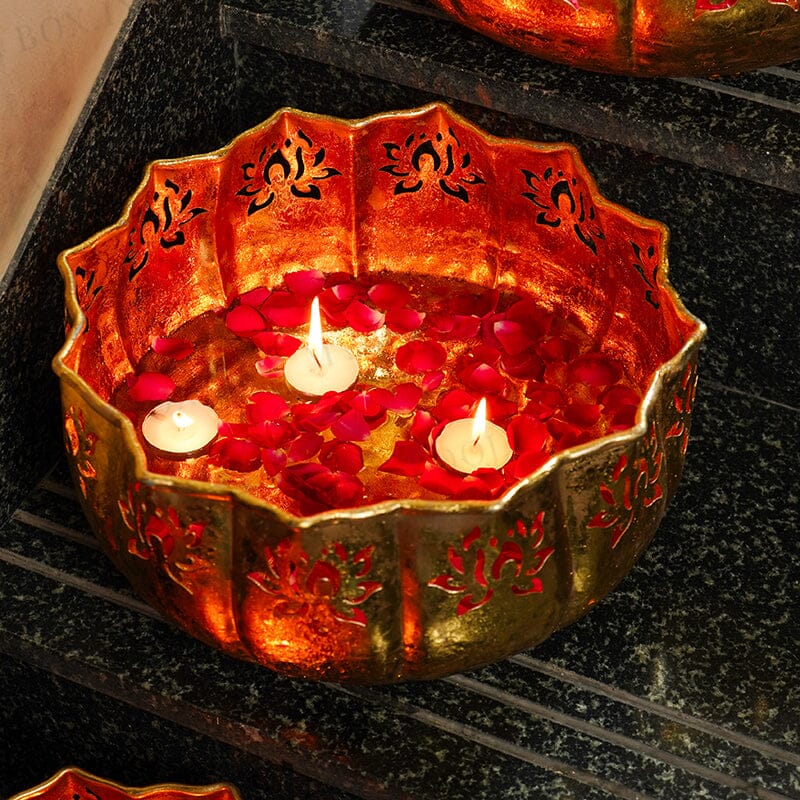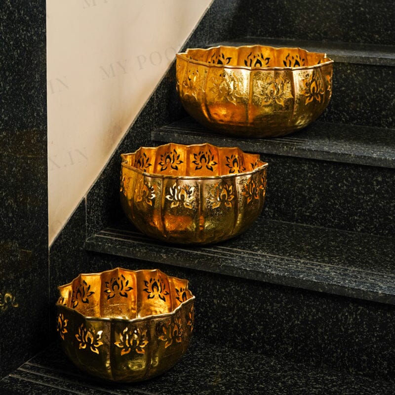 Urli’s are the most useful stuff when it comes to storing small things. I am presenting to you a shiny gold lotus urli. This url is quite astounding and striking in appearance. It is available in various sizes. This urli is made from metal and has a sleek golden colour. On the border are lotus-shaped carvings that look incredible. These urli’s can be used to store flowers and another puja samagri in puja ghar. They have a simple and sober design. They can also be placed as a showpiece. This urli can also be used to decorate puja ghars or living areas during festive occasions. Get these spectacular URLs at the most amazing deals.